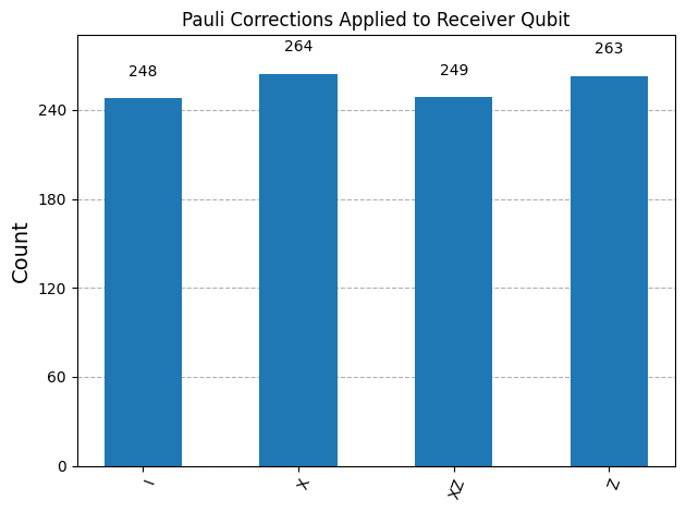plot_histogram(pauli_counts, title="Pauli Corrections Applied to Receiver Qubit")