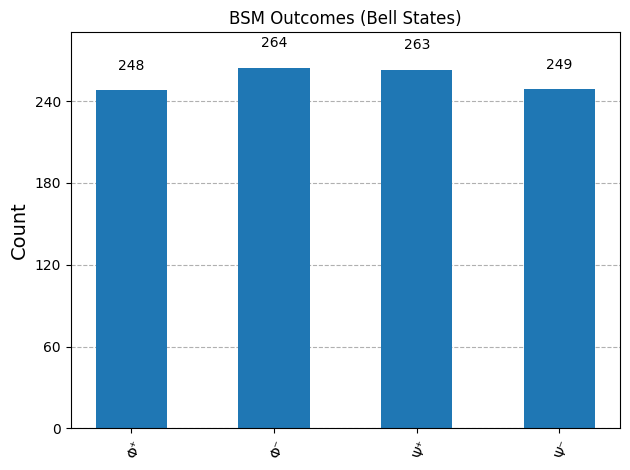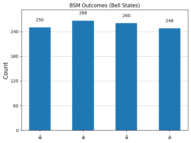 plot_histogram(counts_labeled, title="BSM Outcomes (Bell States)")