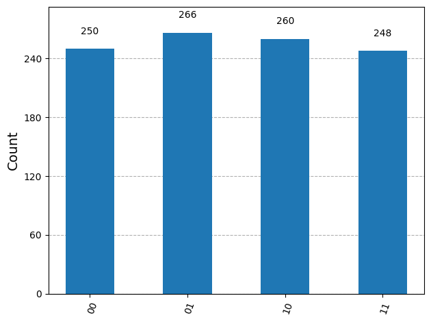 - Next, we posted the results on a histogram to display how Bell States collapse into their four potential states randomly with qubits are in superposition.